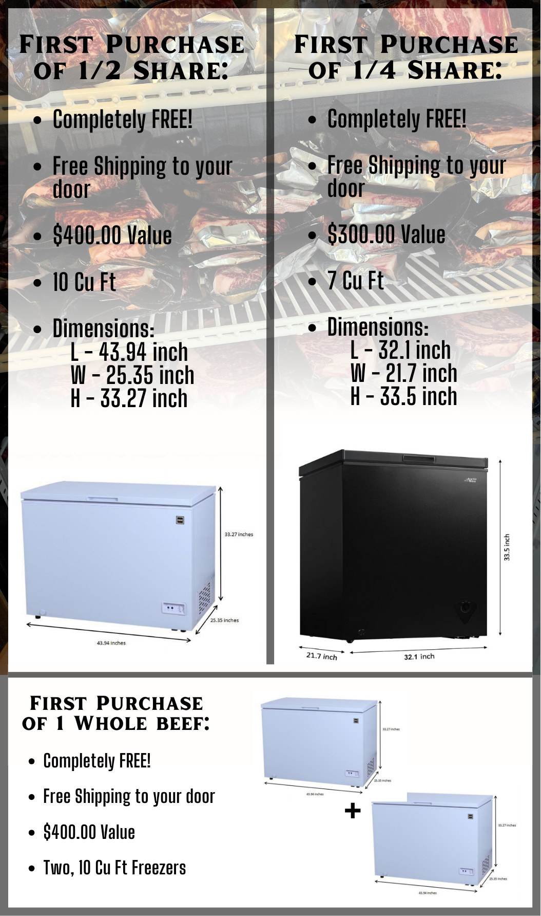 We are so positive that you are going to love the experience of having a constant supply of high quality, prime and heart healthy American Wagyu beef, that we have simplified the buying process, and even give you the freezer space to store your beef share in for FREE!